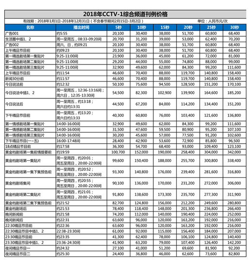 2018年刊例价格