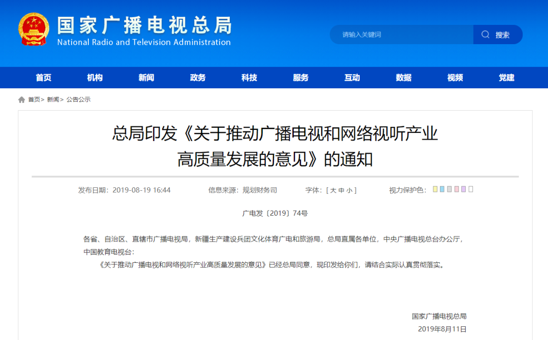 2019年8月19日,广电总局印发《关于推动广播电视和网络视听产业高质量发展的意见》的通知,加快高清电视和4K/8K超高清电视采集制作、集成播出、互动分发、数据中心、管理平台等系统建设,推动高清、超高清电视频道建设,推动高清、超高清电视在有线电视、IPTV和互联网电视的应用,推动普及高清、超高清机顶盒。电视的高清化被正式提上日程。