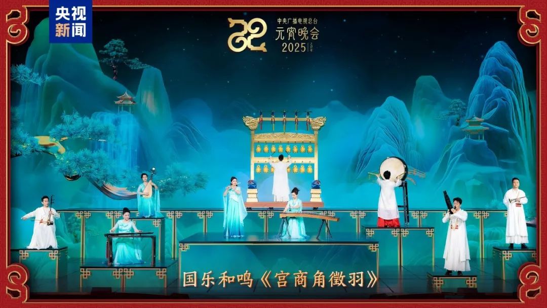 麒麟献瑞,舞蹈《麒麟》中演员们身着翩翩华服,气宇轩昂、英姿飒爽,重现了《诗经》中振振公子的卓然风采。北京、重庆、武汉、拉萨、无锡的五地乐手们,隔空齐奏国乐《宫商角徵羽》,笙、笛、古琴等九种民族乐器共同带来的悠扬五音,奏响五千年中华文明共振同鸣,祈愿新的一年五福临门、五谷丰登。