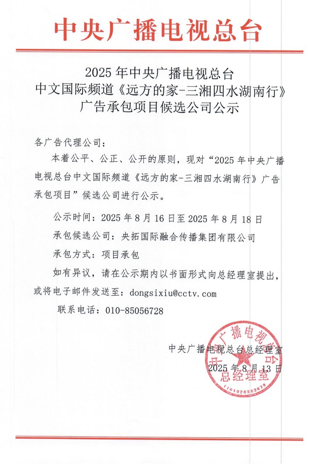 2025年中央广播电视总台中文国际频道《远方的家-三湘四水湖南行》广告承包项目候选公司公示