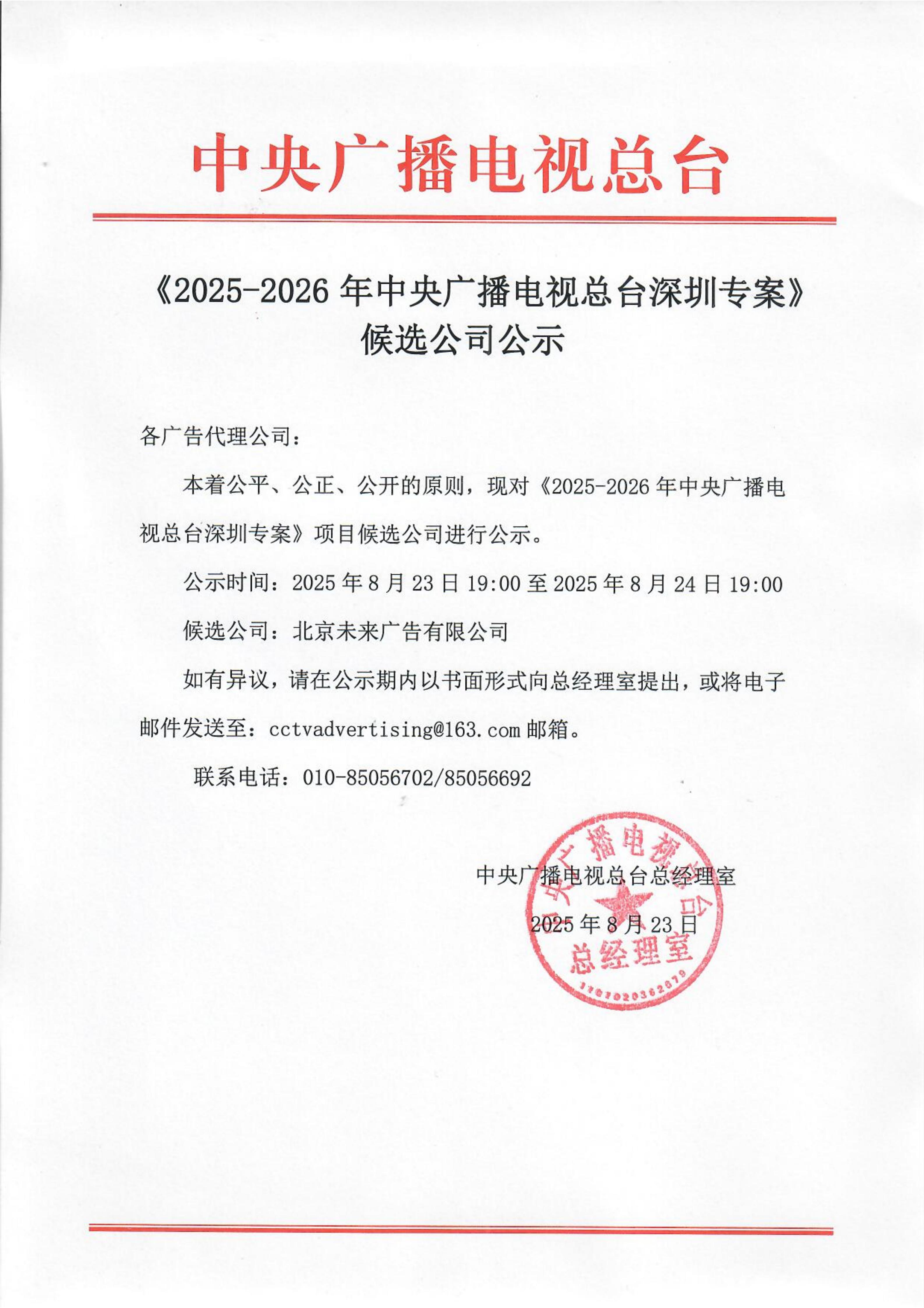 《2025-2026年中央广播电视总台深圳专案》候选公司公示