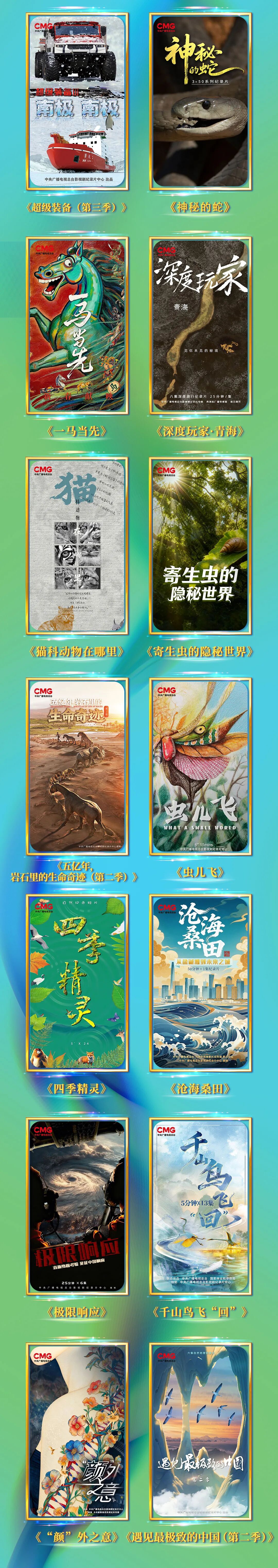 “天地和鸣”板块发布26部佳作,聚焦生命的律动、科技的温度,奏响人与自然和谐共生的协奏曲。《奇境三江源》《生命树》关注三江源珍稀动物与生态保护,描绘人与自然和谐共生的壮美画卷;纪录电影《马到功成》记录四大洲最有代表性的七种马类,在中国马年向世界传递东方生肖文化智慧;作为央地深入合作的新成果,《秦岭·家园》《千里汉江》《遇见最极致的中国(第二季)》呈现大美中国的山河脉动与自然瑰宝之美;《如果植物也有MBTI:不可思议的国家植物园》以脱口秀自述形式,趣解植物的“人格群像”;《地球的体检报告》《不如去看一棵树(第二季)》《考古学家的神秘武器(第二季)》《典故里的科学(第三季)》《科学的七个瞬间(第二季)》等科学类纪录片,生动科普多领域知识,展示科研新成果与科技新成就;《再登地球之巅(第二季)》深入青藏高原,将首次曝光众多科考新发现;《超级装备(第三季)》聚焦我国极地科考最新成果,展现极地装备国产化进程的跨越式发展。此外,《神秘的蛇》《一马当先》《深度玩家·青海》《猫科动物在哪里》《寄生虫的隐秘世界》《五亿年,岩石里的生命奇迹(第二季)》《虫儿飞》《四季精灵》《沧海桑田》《极限响应》《千山鸟飞“回”》《“颜”外之意》等作品,将带观众感受人类创造力与自然法则的奇妙交织,见证文明进阶与生态守护的“双向奔赴”。