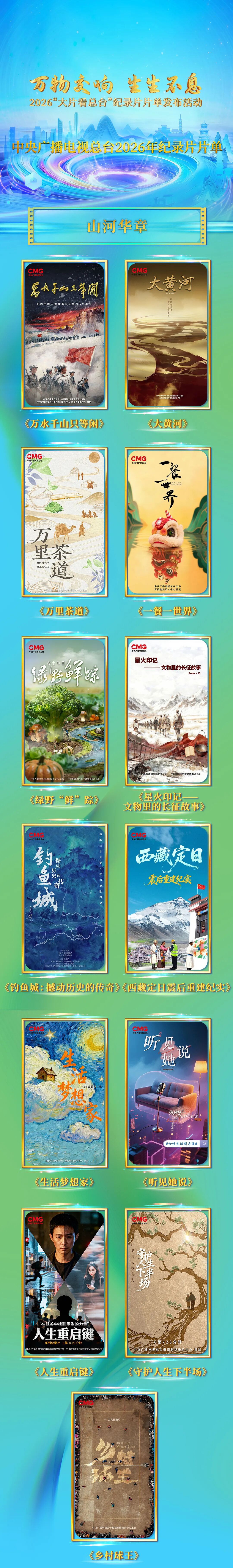 活动以“万物交响 生生不息”为主题,分四大板块,以多元视角捕捉世界精彩、勾勒文明脉络,用创新表达汇聚蓬勃向上的精神力量。“山河华章”板块发布13部精品佳作,记录中国发展历程和中外文化交流足迹。纪念红军长征胜利90周年,纪录片《万水千山只等闲》通过万余份原始文献、五百余位亲历者回忆,重现红军长征艰难岁月,彰显革命先辈的坚定信仰;《星火印记——文物里的长征故事》用珍贵文物见证历史,谱写长征路上血肉丰满的英雄史诗;《大黄河》勾勒黄河流域生态治理与人文风貌,展现母亲河的当代生机;《万里茶道》呈现一段以茶为桥的中俄经济、文化交流故事;《一餐一世界》聚焦中餐申遗的文化实践,凸显中华饮食智慧;《绿野“鲜”踪》寻访牛油果、竹林鸡等标志性农产品原产地,助力乡村振兴发展。《钓鱼城:撼动历史的传奇》《西藏定日震后重建纪实》《生活梦想家》《听见她说》《人生重启键》《守护人生下半场》《乡村球王》等,从不同维度揭示民族精神与时代发展之间的深层联结,展现时代浪潮之下的逐梦者群像。