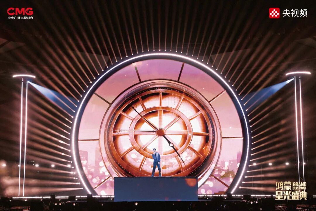盛典以“鸿蒙初开,星河互联”为理念,打造出一座兼具东方哲学意蕴与未来科技感的舞台。象征“天”的曲面球体如星辰初开,寓意鸿蒙系统凝聚万物;象征“地”的水景舞台包容万象,两侧镜面副屏延伸出无限可能的数字世界。舞台本身也是技术的突破——历经8天极限搭建,3065块曲面屏无缝拼接,攻克结构与曲率的双重挑战;8组灯光塔构筑起立体的“光宇宙”,书写万物互联的科技诗篇。在节目效果呈现上,盛典将AR、AI等前沿技术深度融合,打破物理与虚拟的界限,传递科技温度。
