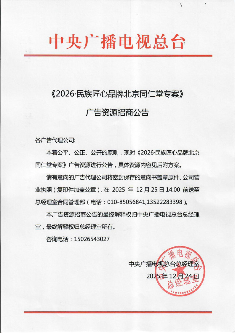 《2026·民族匠心品牌北京同仁堂专案》广告资源招商公告