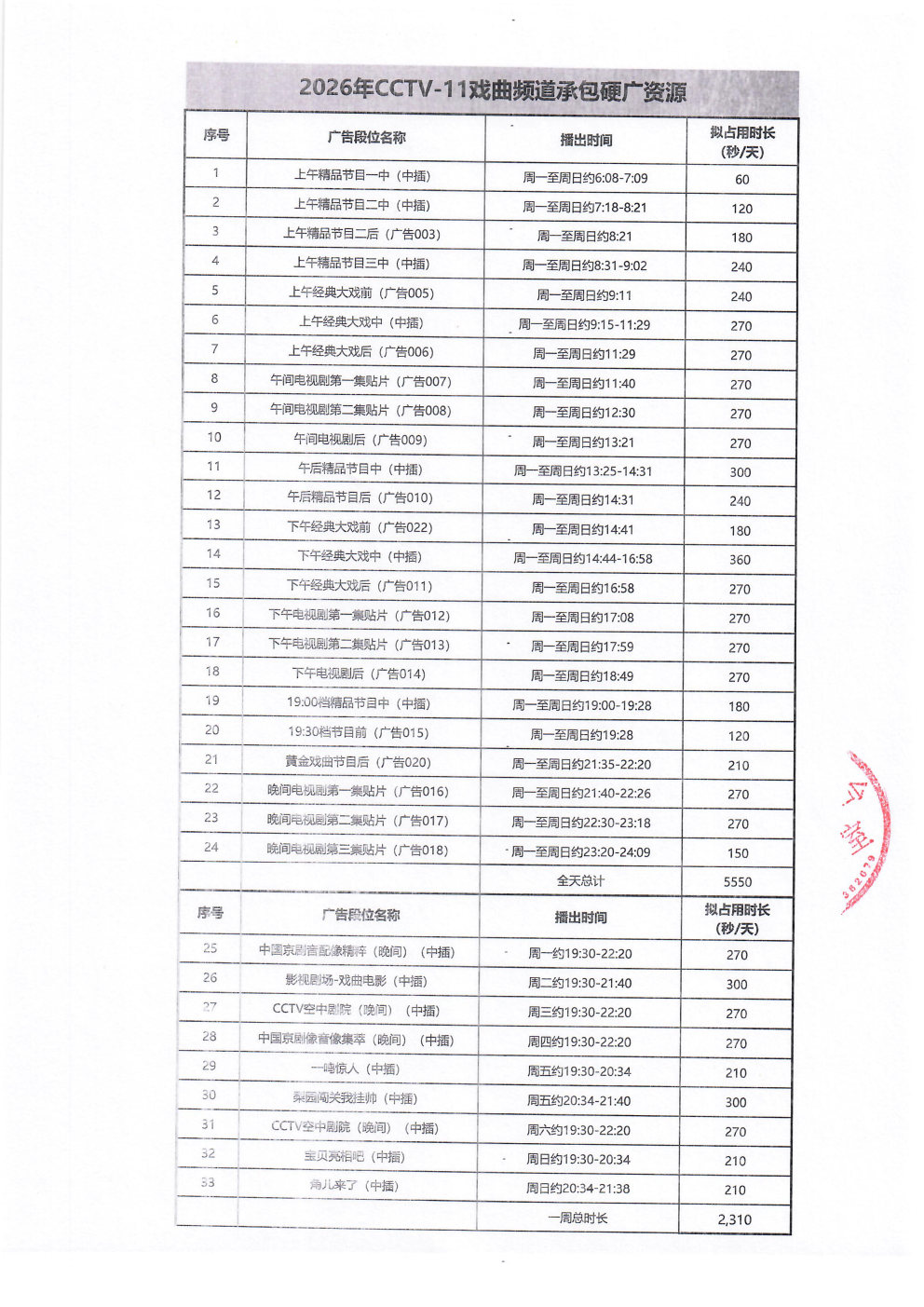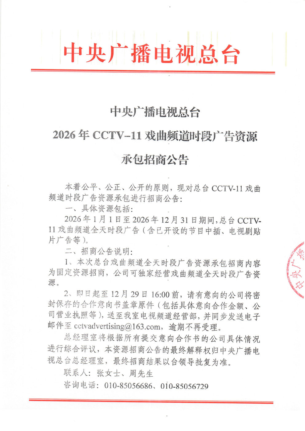 中央广播电视总台2026年CCTV-11戏曲频道时段广告资源承包招商公告