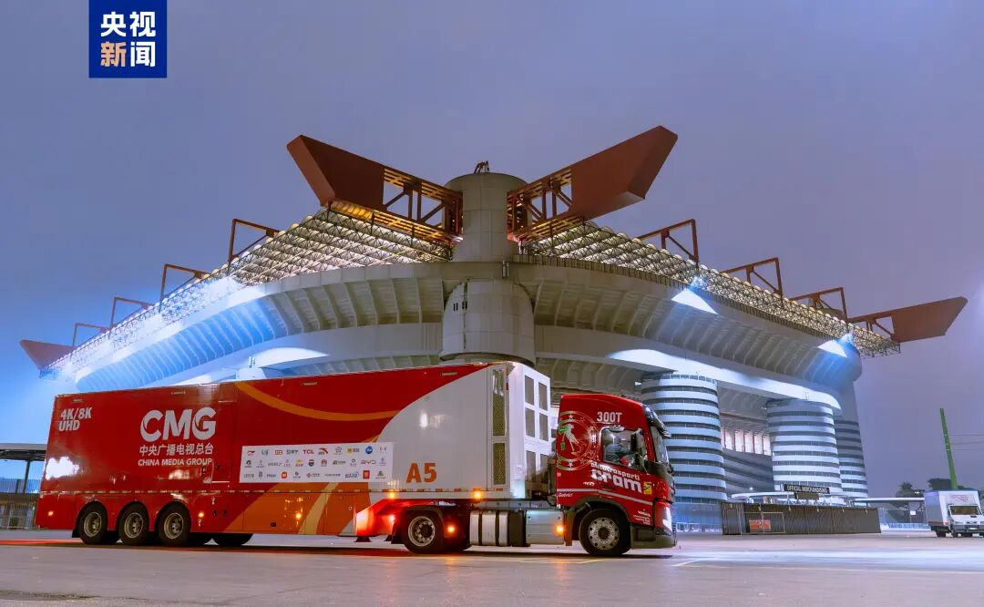 △总台“中国红”超高清转播车队抵达米兰圣西罗体育场